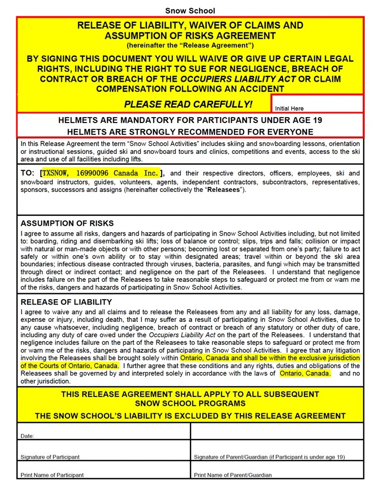 所有参与者在参加任何滑雪学校活动之前,必须签署WAIVER。对于19岁以下的参与者,必须由父母或监护人代为签署WAIVER。
